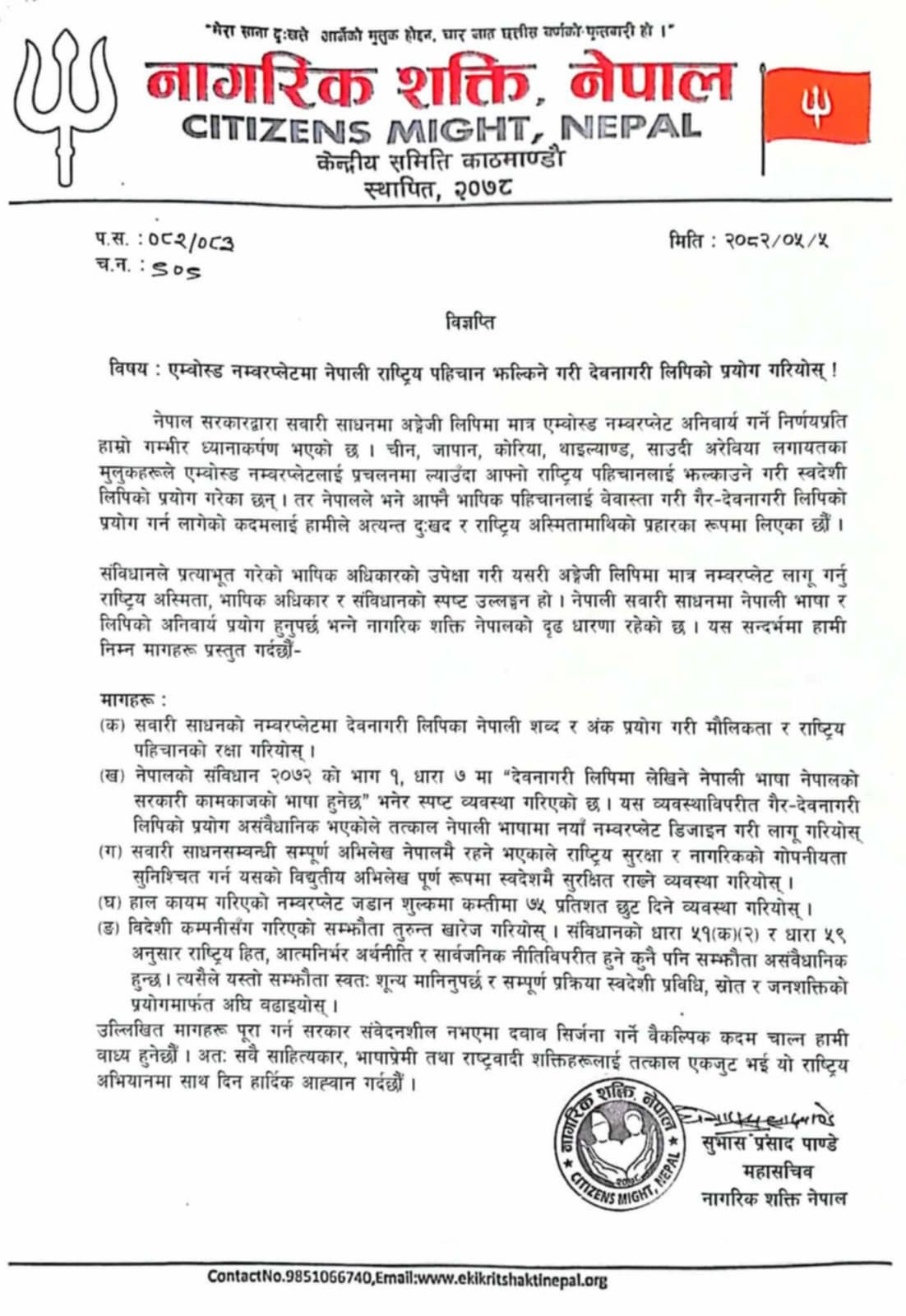 संगठनले विज्ञप्ति जारी गर्दै यस्तो निर्णयले नेपाली भाषा, लिपि र राष्ट्रिय पहिचानमाथि प्रहार गरेको आरोप लगाएको हो ।नागरिक शक्ति नेपालका महासचिव सुबास प्रसाद पाण्डेद्वारा जारी विज्ञप्तिमा संविधानले नेपाली भाषा देवनागरी लिपिलाई सरकारी कामकाजको भाषा मानेको हुँदा नम्बरप्लेटमा देवनागरी प्रयोग नगर्नु संविधानविपरीत रहेको उल्लेख गरिएको छ ।