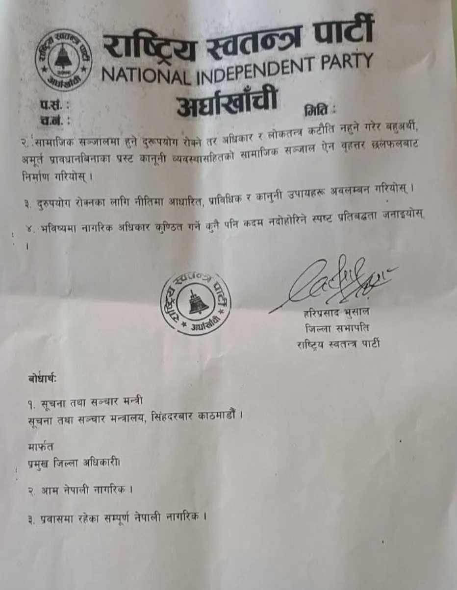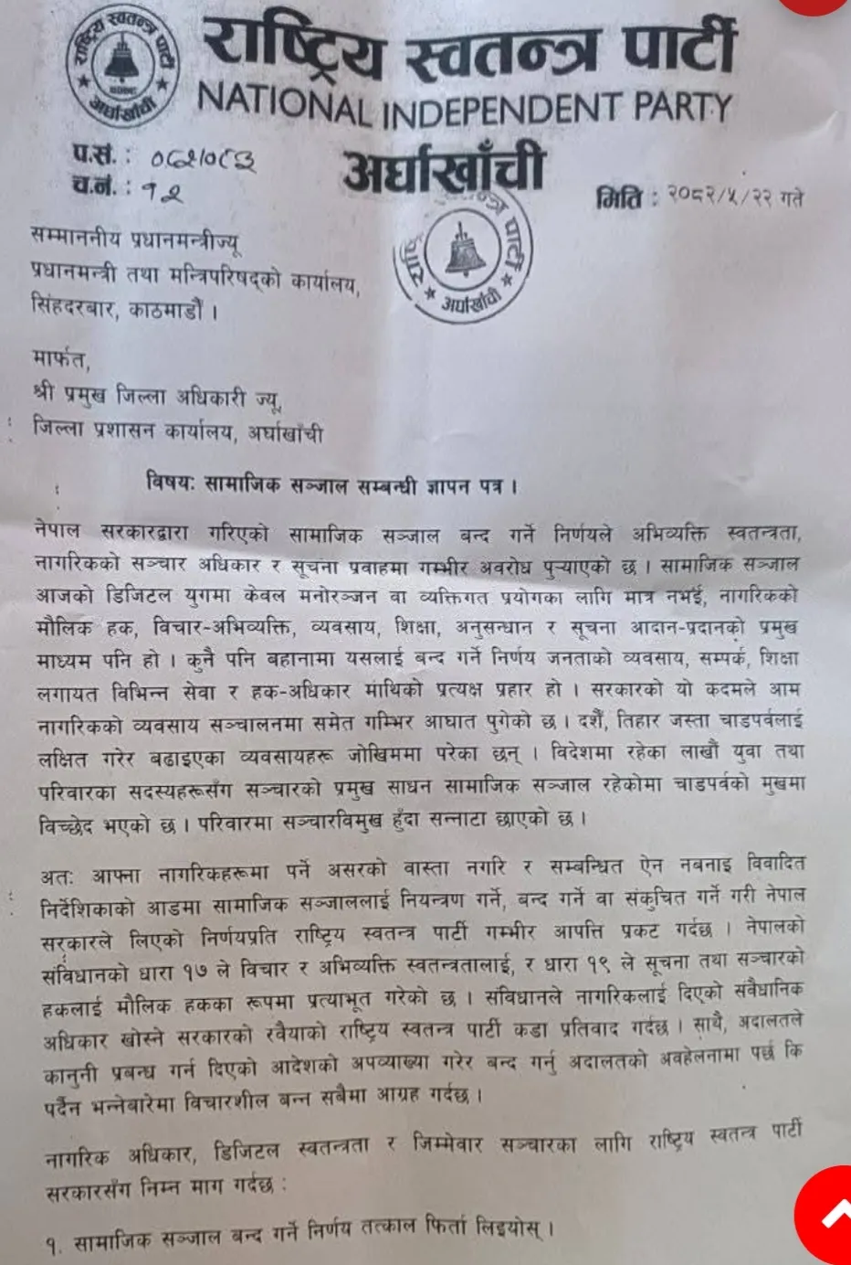राष्ट्रिय स्वतन्त्र पार्टी अर्घाखाँचीका पदाधिकारी तथा कार्यकर्ताले आज जिल्ला प्रशासन कार्यालय पुगेर ज्ञापनपत्र बुझाउँदै सामाजिक सञ्जाल बन्दको निर्णय अभिव्यक्ति स्वतन्त्रता, सूचना पाउने अधिकार र नागरिकको मौलिक हकमा ठाडो प्रहार भन्दै आपत्ति जनाए छन् ।