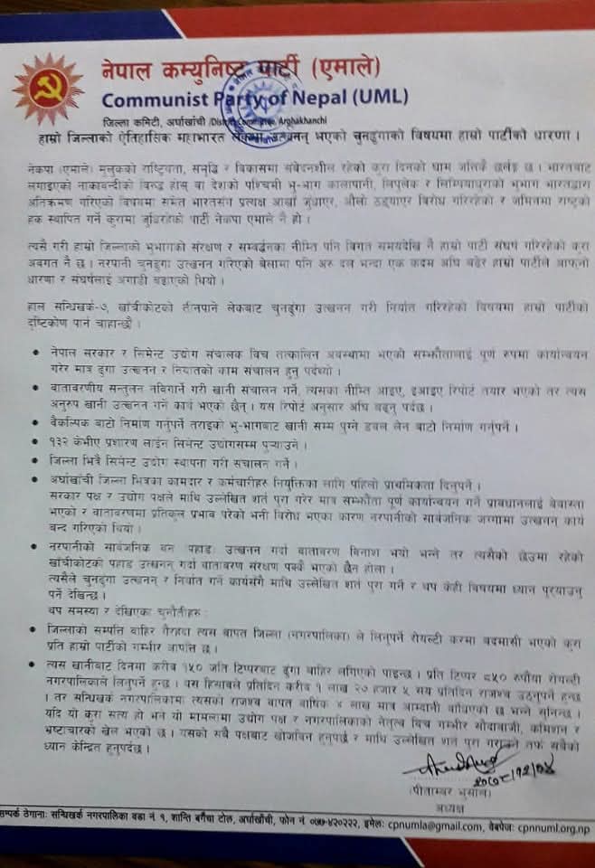 जिल्ला, नगरपालिका र एमाले पार्टी वरिपरि का धेरै नेताहरू भ्रष्टाचारमा डुबेका छन् भन्ने सत्य होइन र? राजनीति भनेको के केवल २/४ अन्धभक्त ले पुज्ने आरति गर्ने अनि समाज लुट्ट्ने खोक्रो आदर्श देखाउने नाटक त होइन? समाज लाई बचाउने होइन, बिगार्ने यस्ता गतिविधि किन पार्टीले अंगालेको छ? जिल्ला अध्यक्षज्यू, यो पत्रमा उठाइएका प्रश्नको जवाफ दिने हिम्मत र ल्याकत छ भने दिनुहोस्, नत्र जनता लाई भ्रममा पार्ने, ठग्ने एमाले भनेर किन नमान्ने?