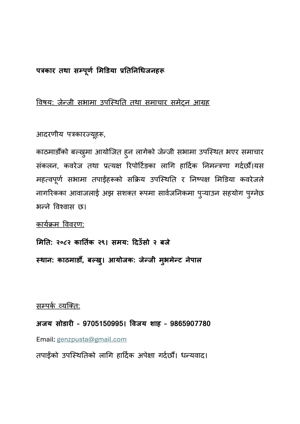 काठमाडौँ — जेन्जी मुभमेन्ट नेपालले काठमाडौँको बल्खुमा आज दिउँसो २ बजे सभा आयोजना गर्ने भएको छ। आयोजकका अनुसार सभामा हाल देशमा उठिरहेका युवा आन्दोलनका मुद्दा, सामाजिक–राजनीतिक परिवर्तनका विषय तथा नयाँ पुस्ताले अघि सारेका एजेन्डाबारे सार्वजनिकरूपमा धारणा राखिनेछ।