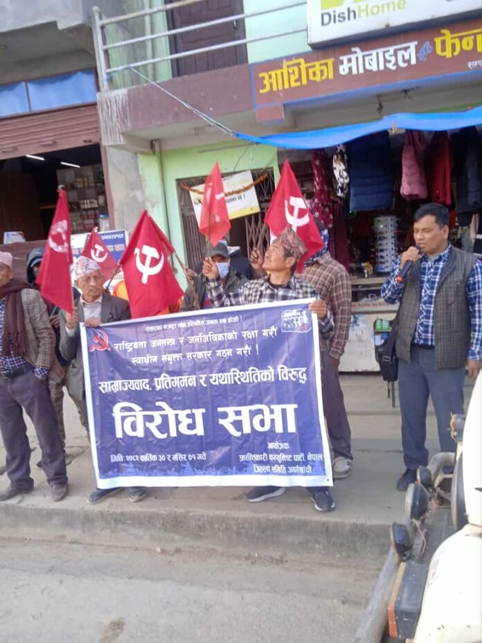 मिति २०८२ कार्तिक ३० गते क्रान्तिकारी कम्युनिस्ट पार्टी नेपाल जिल्ला समिति अर्घाखाँचीको आयोजनामा साम्राज्यवाद प्रतिगमन र यथास्थितिको विरोध गरौं राष्ट्रियता जनतन्त्र जीविकाको रक्षा गरौं। स्वधीन संयुक्त सरकारको गठन गरौं।