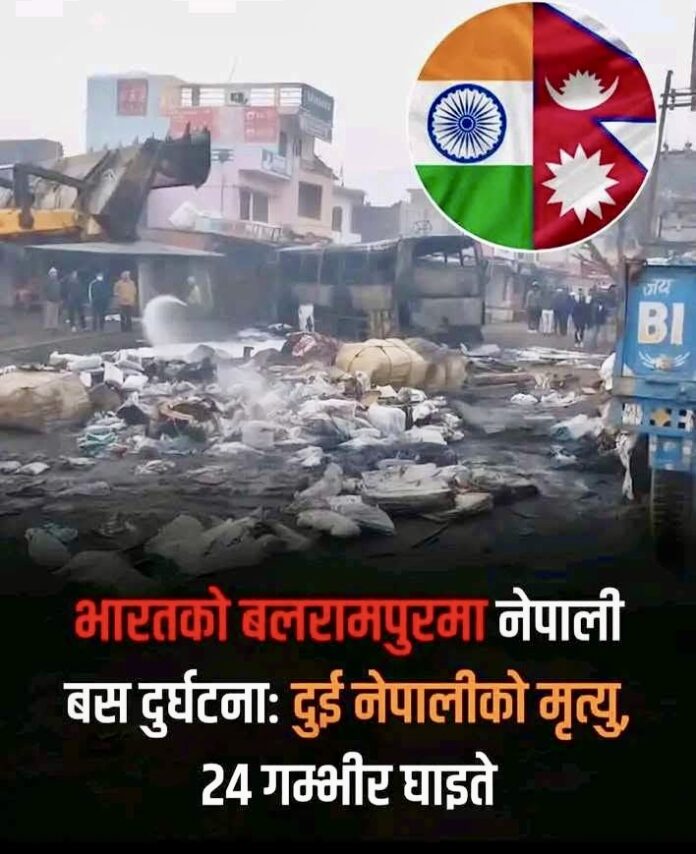 मङ्सिर १५: भारतको उत्तर प्रदेशस्थित बलरामपुरमा सोमबार राति नेपाली यात्रु बोकेको बस दुर्घटनामा परेर दुई जना नेपालीको मृत्यु भएको छ। दुर्घटनामा २४ जना गम्भीर घाइते भएका छन्।