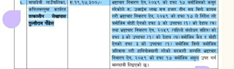 उनी केही वर्षअघि कपिलवस्तुको मायादेवी गाउँपालिकामा लेखा अधिकृतका रूपमा कार्यरत रहँदा ठूलो रकम हिनामिनासम्बन्धी आरोपमा अनुसन्धान हुँदै आएको थियो। सोही प्रकरणमा निरन्तर प्रक्रिया अघि बढ्दै जाँदा हिजो उनलाई आयोगले पक्राउ गरेको पुष्टि भएको छ।