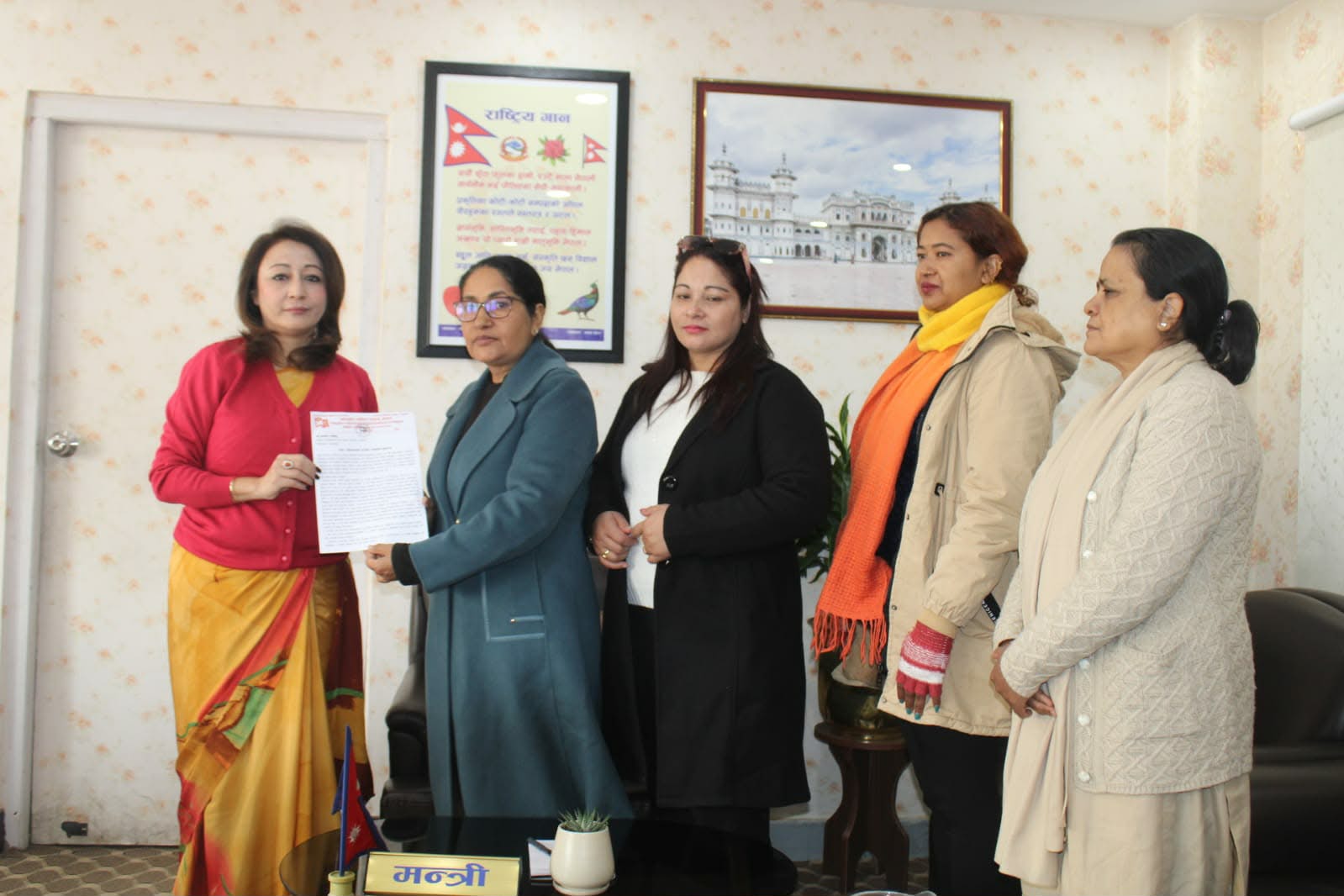 आज संगठनकी अध्यक्ष इन्दिरा अधिकारी नेतृत्वको प्रतिनिधिमण्डलले महिला, बालबालिका तथा ज्येष्ठ नागरिक मन्त्री श्रद्धा श्रेष्ठसँग भेट गरी १६ बुँदे जनपक्षीय माग प्रस्तुत गरेको हो।