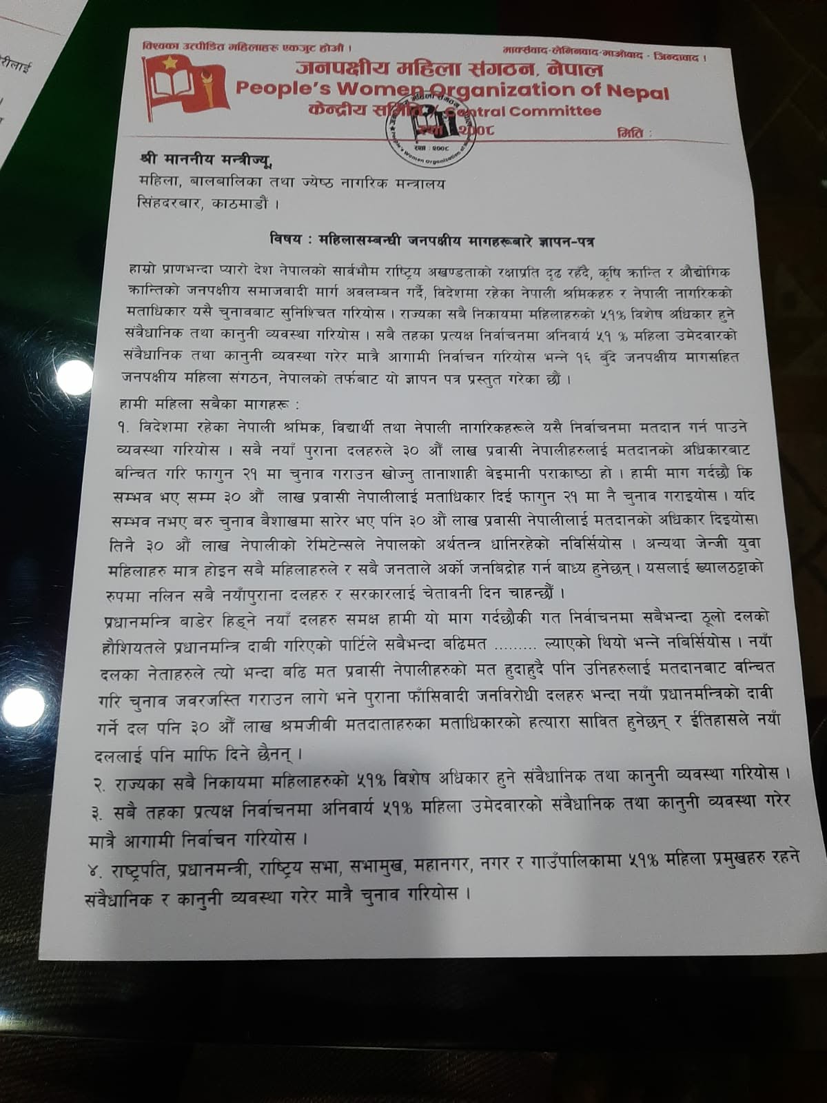 विदेशमा रहेका तीसौं लाख नेपालीको मताधिकार सुनिश्चित गर्न जनपक्षीय महिला संगठनको १६ बुँदे माग