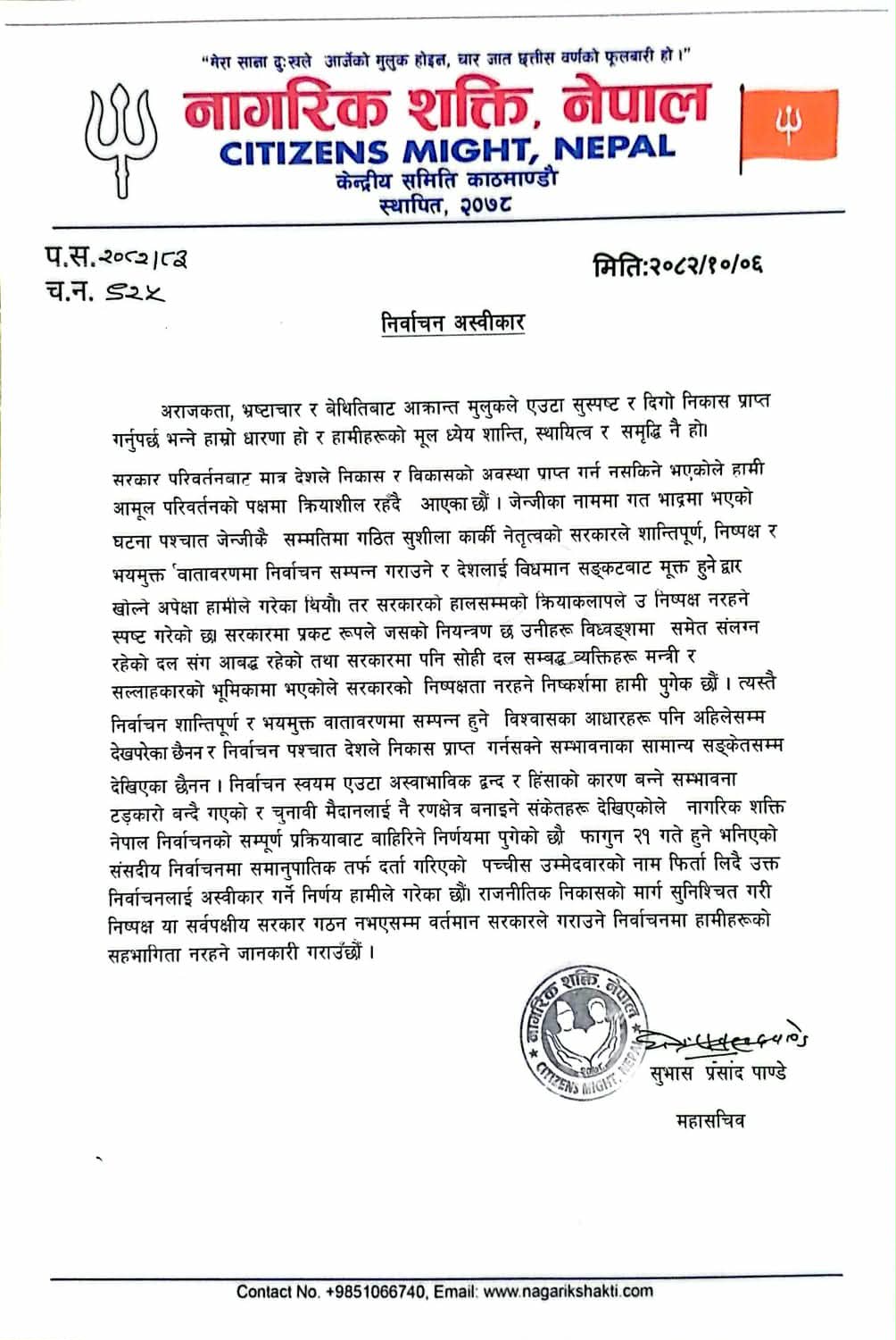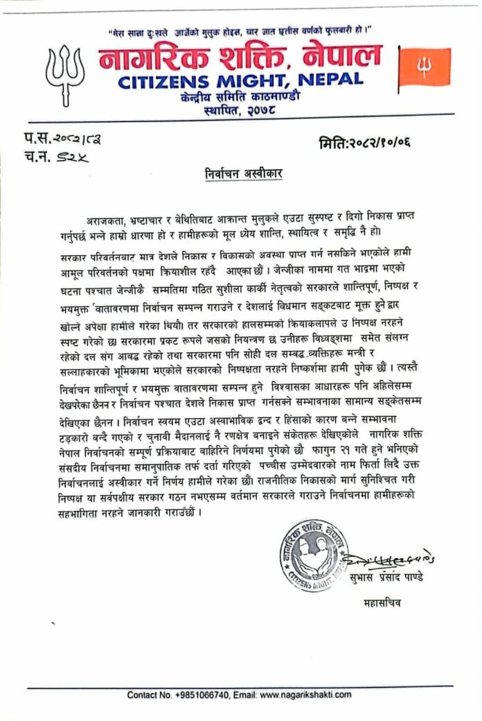 काठमाडौँ। देव प्रकाश त्रिपाठी नेतृत्वको नागरिक शक्ति, नेपालले वर्तमान राजनीतिक अवस्था, सरकारको चरित्र र निर्वाचन प्रक्रियाप्रति गम्भीर प्रश्न उठाउँदै आगामी निर्वाचनलाई औपचारिक रूपमा अस्वीकार गर्ने घोषणा गरेको छ। केन्द्रीय समिति काठमाडौँद्वारा जारी विज्ञप्तिमार्फत संगठनले निर्वाचन स्वतन्त्र, निष्पक्ष र भयमुक्त वातावरणमा सम्पन्न हुन नसक्ने ठहरसहित निर्वाचन प्रक्रियाबाट बाहिरिने निर्णय सार्वजनिक गरेको हो।