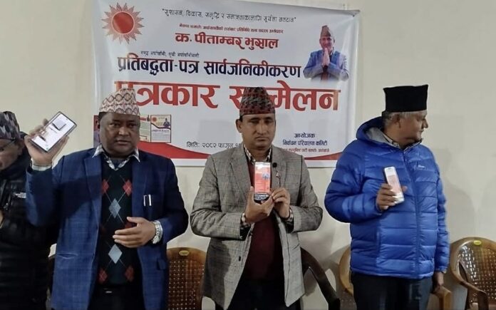 प्रतिबद्धता पत्र सार्वजनिक गर्दै कृषक, युवा, विद्यार्थी, उद्यमी तथा आम नागरिकको जीवनस्तर उकास्ने स्पष्ट कार्ययोजना अघि सारेका हुन् । पत्रकार सम्मेलनमा उम्मेदवार भुसालले कृषिलाई सम्मानित पेशाका रूपमा स्थापित गर्न किसान निवृत्तिभरण कार्यक्रम लागू गरिने बताएका छन् । उनले कृषि उपजले बजार नपाएर किसान निराश हुनुपर्ने अवस्था अन्त्य गर्ने प्रतिबद्धता व्यक्त गर्दै न्यूनतम समर्थन मूल्य निर्धारण गरी सरकारले नै खरिद गर्ने व्यवस्था गरिने उल्लेख गरे ।