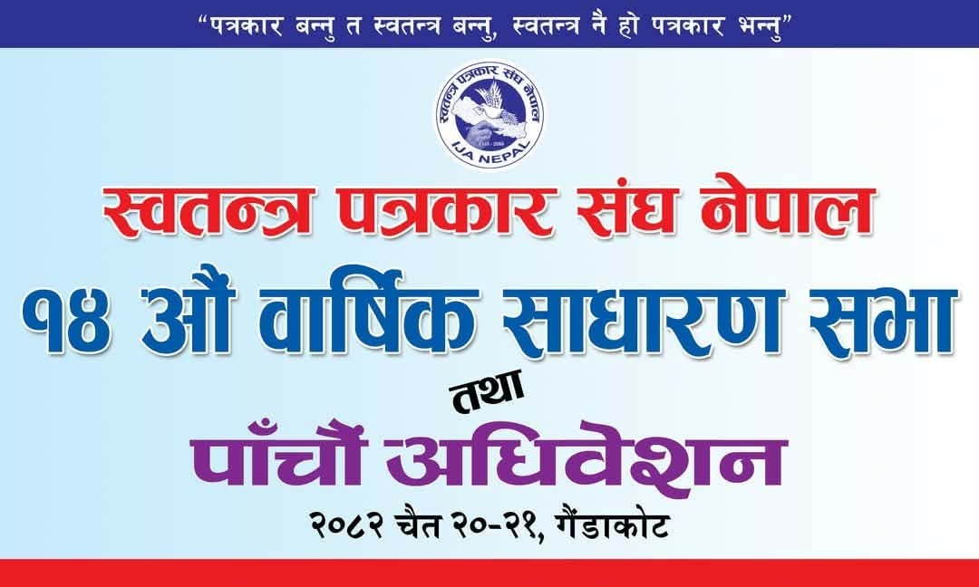 स्वतन्त्र पत्रकार संघको पाँचौं अधिवेशन गैँडाकोट : स्वतन्त्र पत्रकार संघ नेपालको चौधौं वार्षिक साधारणसभा तथा पाँर्चौ अधिवेशन नवलपुर जिल्लाको गैँडाकोटमा शुक्रबारबाट सुरु हुँदैछ । भोलि शनिबारसम्म हुने अधिवेशनले स्वतन्त्र पत्रकार संघको नयाँ नेतृत्व चयन गर्नेछ । नेपाल पत्रकार महासंघमा राजनीतिक दलसम्वद्ध पत्रकार संगठनको सिन्डिकेटको विरोध गर्दै २०६८ सालमा स्थापना भएको स्वतन्त्र पत्रकार संघ ३५ जिल्लामा विस्तार भएको। गैँडाकोटस्थित मौलाकालिका मन्दिर नजिकै भण्डारी समाजको सभाहलमा हुने अधिवेशनका क्रममा जिल्ला अध्यक्षहरुलाई सम्मान गर्नुका साथै २५ हजार राशीको सामाजिक पत्रकारिता पुरस्कार पोखराका अग्रज पत्रकार उदयबहादुर अमात्यलाई प्रदान गरिनेछ ।