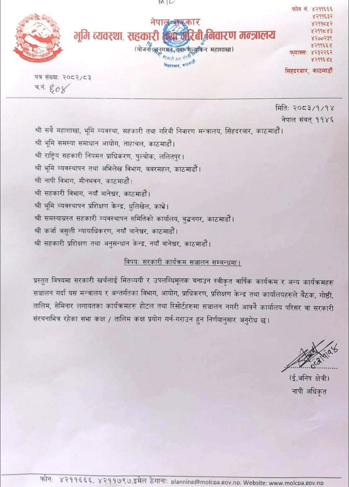 भूमि व्यवस्था, सहकारी तथा गरिबी निवारण मन्त्रालय मातहतका सबै कार्यालयका कार्यक्रमहरू अब कार्यालय भित्रकै सभा हल तथा बैठक कक्षमा मात्रै गर्नुपर्ने भएको छ। मन्त्रालयको योजना अनुगमन तथा मूल्याकंन महाशाखाले आज सबै महाशाखा, आयोग, प्राधिकरण, विभाग तथा कार्यालयहरूलाई परिपत्र गर्दै सरकारी खर्चलाई मितव्ययी र उपलब्धिमूलक बनाउन यस्तो निर्देशन दिएको हो ।