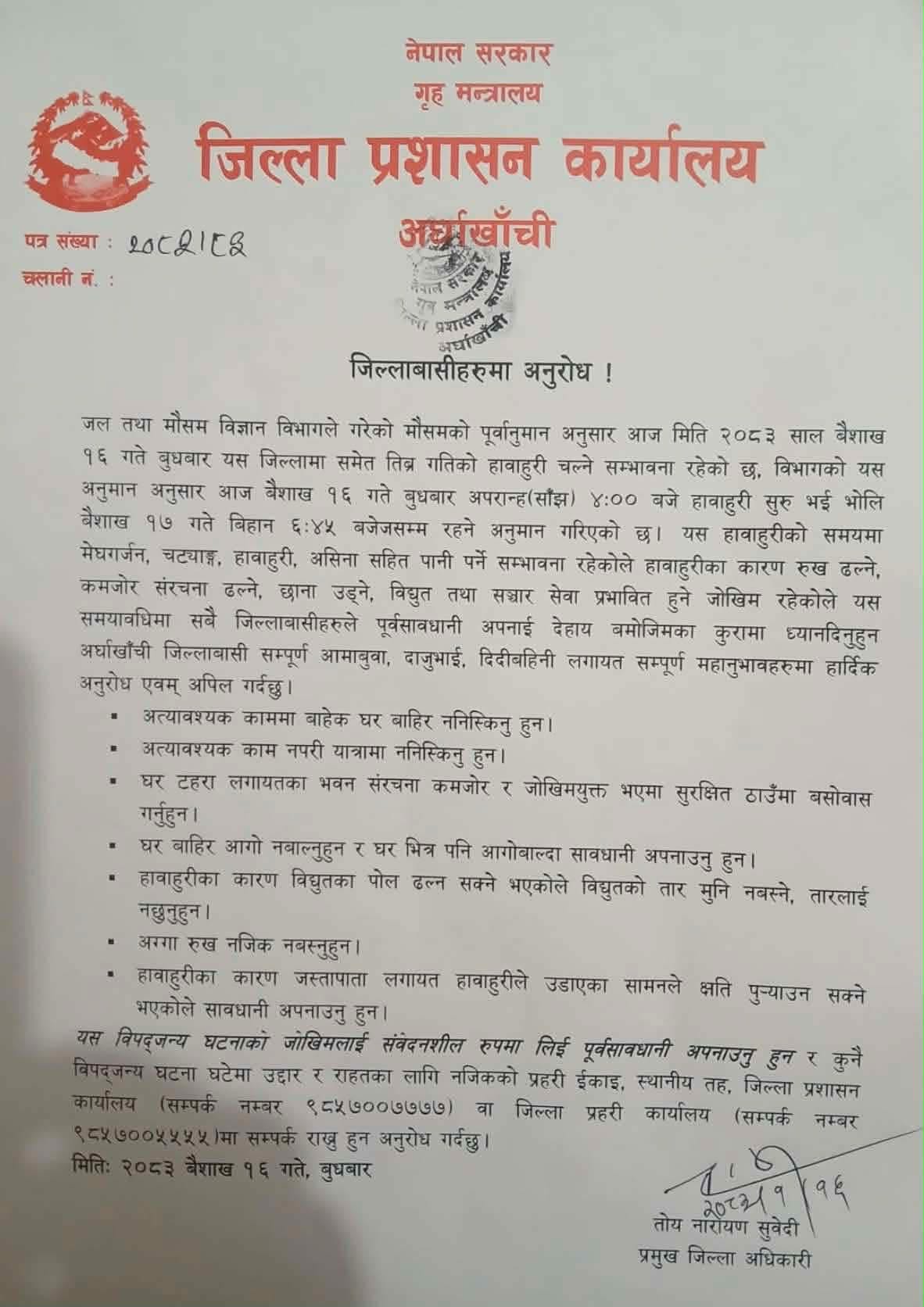 जल तथा मौसम विज्ञान विभागको पूर्वानुमान अनुसार आज बुधबार अपराह्नदेखि देशका विभिन्न जिल्लाहरूमा तीव्र गतिको हावाहुरी चल्ने सम्भावना देखिएको छ। जिल्ला प्रशासन कार्यालय अर्घाखाँचीले एक सार्वजनिक सूचना जारी गर्दै आज वैशाख १६ गते बुधबार दिउँसो ४:०० बजेदेखि भोलि वैशाख १७ गते बिहान ६:४५ बजेसम्म विशेष सावधानी अपनाउन जिल्लाबासीहरूमा हार्दिक अनुरोध गरेको छ। यो हावाहुरीको प्रभाव लुम्बिनी प्रदेशका अर्घाखाँची, बर्दिया, बाँके, दाङ र परासीका साथै सुदूरपश्चिमका कञ्चनपुर, डडेलधुरा र डोटीमा बढी देखिने अनुमान गरिएको छ। त्यस्तै गण्डकी र बागमती प्रदेशका नवलपुर र चितवन, मधेश प्रदेशका बारा, पर्सा र धनुषा तथा कोशी प्रदेशका झापा र मोरङ जिल्लाहरू समेत प्रभावित क्षेत्रको सूचीमा रहेका छन्।